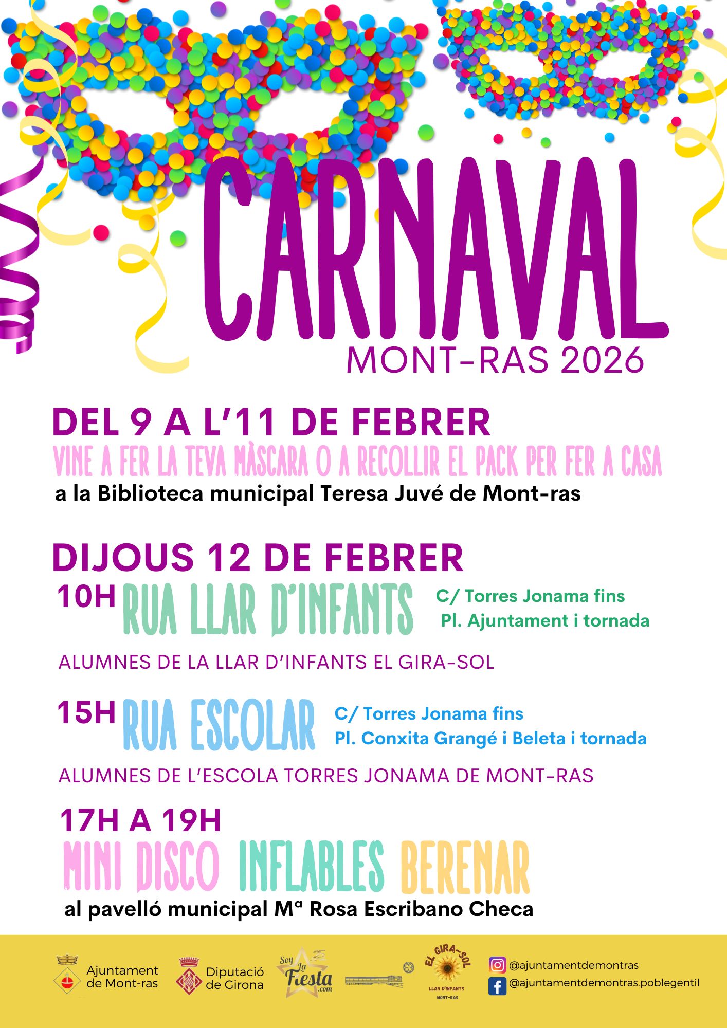Dijous 12 de febrer: 10h Rua Llar d’infants / 15h Rua escolar / 17h a 19h Carnaval! Mini disco, inflables i berenar